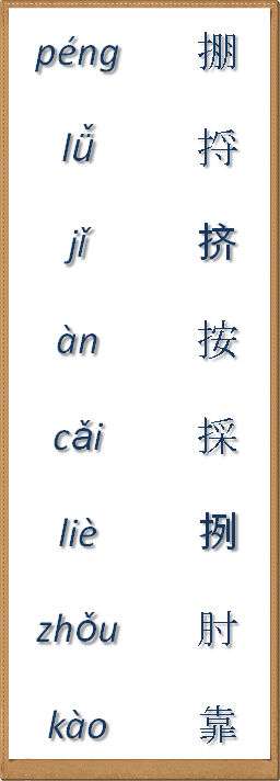 | 靠 Kào | 捋 Lǚ | 掤 Péng | 挤 Jǐ | 採 Cǎi | 按 An | 肘 Zhǒu | 挒 Liè |