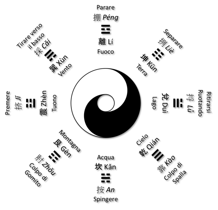 | Nel descrivere le 8 forze del taiji attraverso i Gua che le rappresentano, alcuni usano associare il tratto inferiore alle gambe, l’ intermedio al tronco e quello superiore alle braccia. Analizziamo le principali: Peng – parare E’ Li, il Fuoco, due tratti yang che racchiudono un tratto yin; è l’ espansione. E’ raffigurato come “punto“: il punto di contatto di un pallone che si gonfia per parare un colpo. L’energia di Peng è come “una barca che galleggia sull’acqua”. Nell’esecuzione, l’intenzione non deve essere posta sul braccio che para, ma sul gluteo opposto; bisogna sentirsi seduti. Lu – ritirarsi ruotando E’ Dui, il Lago (o valle), un tratto yin sopra due tratti yang; è la trasformazione. E’ raffigurato come “linea“: la linea della cedevolezza con cui si assorbe la forza dell’ avversario per deviarla. L’energia è “come una barca che gira”; la rotazione è nelle anche. E’ come “un tronco galleggiante sull’acqua che viene spinto e quindi ruota”: se non interviene una forza esterna, non succede nulla. L’intenzione è quella di sentire l’acqua, non è sul braccio; il braccio è come il legno che galleggia. | Ji – premere E’ Zhen, il Tuono, due tratti yin sopra un tratto yang: è la concentrazione. E’ raffigurato come “superficie“: l’onda di qi che monta dopo l’assorbimento, prima di sprigionare la sua forza. L’energia di Ji ha la caratteristica dell’acqua: l’acqua riempie tutti gli spazi vuoti; se si lascia uno spazio vuoto, l’acqua entra. Compito di Ji è trovare lo spazio vuoto dell’avversario, il suo difetto. Bisogna sentire tutto rotondo, tutto pieno: energia piena. An – spingere E’ Kan, l’ Acqua, due tratti yin che racchiudono un tratto yang; è l’esteriorizzazione. E’ raffigurato come “volume“: l’ onda dell’acqua che si riversa all’ esterno. Il M° Wang per spiegare queste quattro forze, energie, invita a “sentire” l’acqua. L’acqua è una forza molto importante, le cui caratteristiche sono : l’ acqua scorre, non si ferma mai; non va mai diritta, fa l’onda; fa mulinelli; può essere come uno specchio. Nella pratica, bisogna allenarsi a far partire la forza dall’anca per trasmetterla alla spalla, al gomito, al poslo e ricercare l’armonia. |