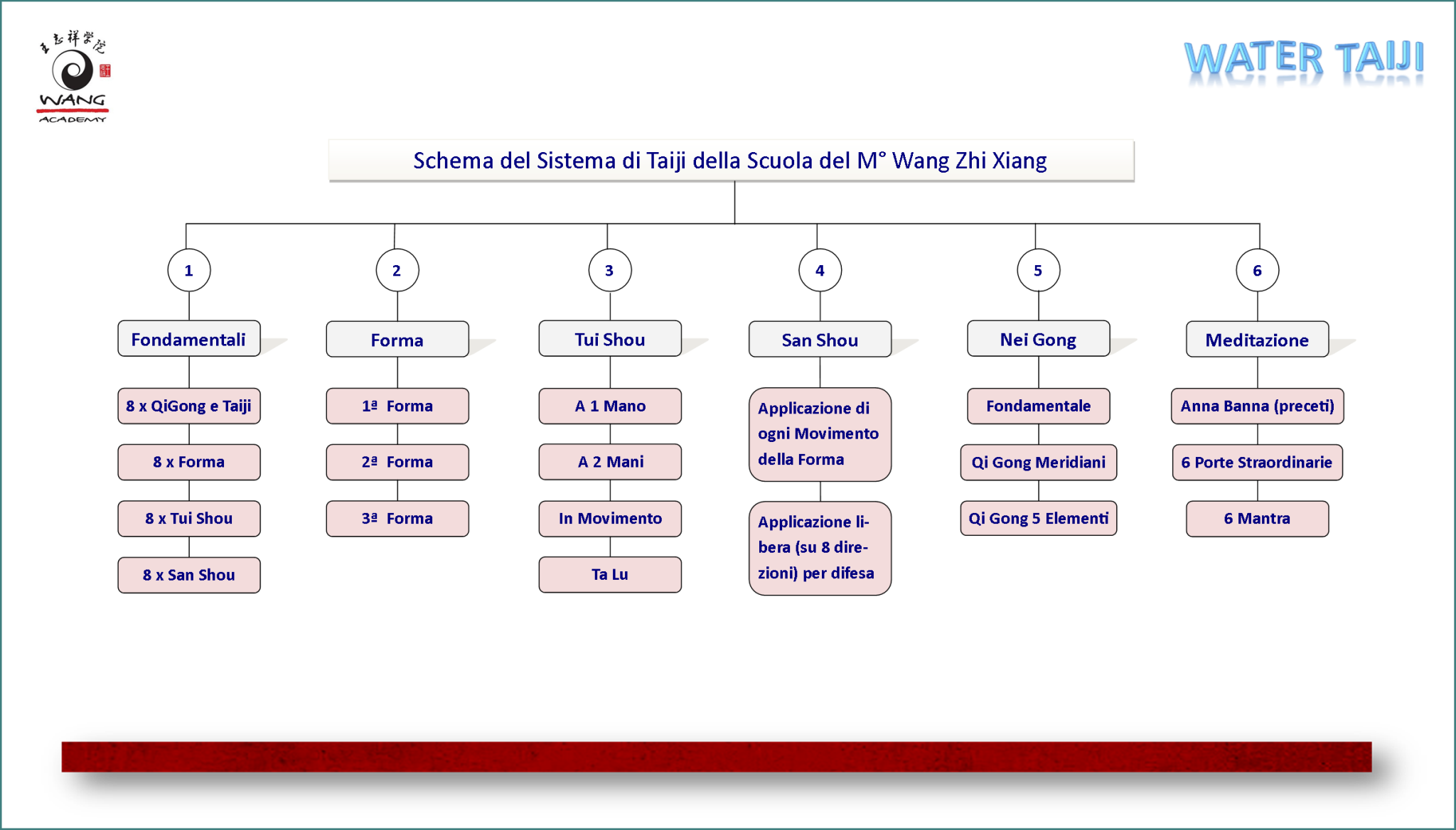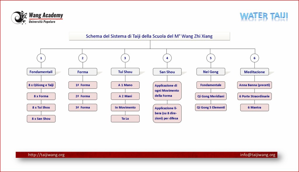| Lo studio completo del Taiji Quan proposto dal M° Wang richiede l’ apprendimento e la conoscenza dell’ intero sistema, che copre cinque aree : 1- lo studio dei principi fondamentali dello stile; 2- lo studio della forma “a solo” (forma lunga 85 posizioni di stile Yang); 3- lo studio e la pratica del Tui-Shou (detto anche “mani che spingono”), un esercizio a due per sviluppare senibilità e ascolto; 4- studio e pratica del San-Shou, altro esercizio a coppie di sparring più libero; 5- lo studio del Nei Gong (Qi Gong, Meditazione, … ) per sviluppare l’ energia interna. Per quel che riguarda la sequenza “a solo”, il M° Wang basa il propio sistema di insegnamento su tre forme separate, che rappresentano differenti livelli di pratica. Ogni forma segue la stessa sequenza di movimenti, ma ognuna ha il suo propio “sapore” nell’ espressione del movimento. La prima forma, ascrivibile a DongYin Jie, è sostanzialmente la forma lunga (o grande intelaiatura) della famiglia Yang di Yang Cheng Fu, differendone però per modo di esecuzione (comp). E’ la forma di base, relativamente più “semplice” ed angolata delle altre, in cui si pone un forte accento sulla corretta postura ed allineamento del corpo, fornendo un apprendimento completo dei fondamentali del Taiji; l’ energia (del corpo) dovrebbe scorrere fluida come l’ acqua di un fiume. La seconda forma, appresa da Dong Bin, è più dinamica e complessa nell’ esecuzione dei movimenti ed esprime in maniera più evidente le sue qualità marziali. Questa forma ha una qualità tipo onda che è generata espandendo il fluire del movimento sviluppato nella prima forma; qui l’ energia scorre simile alle onde dell’ oceano. E’ particolarmente utile per sviluppare e raffinare l’ abilità e la qualità nella “spinta di mani” (Tui Shou) e nello sparring. La terza forma è definita dal M° Wang la “Forma Naturale” (o “forma dell’ acqua”), dovuta a Wang Zhuang Hong. Anche questa forma è “dinamica” con una modalità di movimento ancora più complessa di quella della seconda. L’ energia qui si evolve in movimenti avvolgenti, in spirali, come in un mulinello, o un tornado. Il M° WZH definiva questa forma “Taiji di stile Wang”, riferendosi a Wang Zhong Yue, uno dei maggiori autori dei “Classici del Taiji“ |
