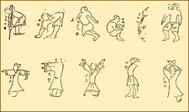 | 8 玉柱七颠 | Yu chu ch’ien tien | battere il piede sette volte (Yuzhu significa pilastro di giada, con riferimento alla spina dorsale) |