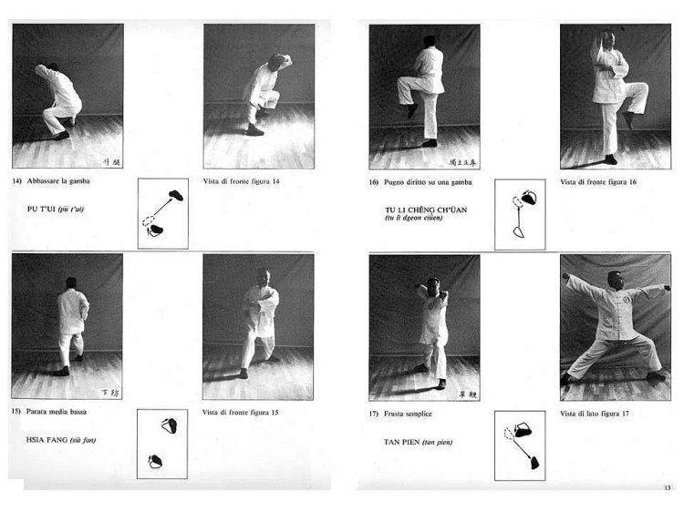 17. Ts’uo Pu – P’eng Ta: In posizione seduta(richiamando la gamba dx), parare verso l’ alto (braccio sx) e colpire(pugno diritto dx)