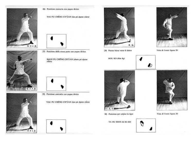 26. Shun Pu – Tso Cheng Chuan ; Yao Pu – Yu Cheng Chuan : In rapida successione, portare un pugno diritto sinistro e quindi uno destro