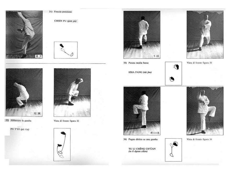 34. Tsuo Pu – P’eng Ta : In posizione seduta(richiamando la gamba dx), parare verso l’ alto(sx) e colpire(pugno diritto destro in dir N)